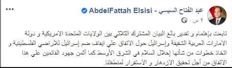 وقال الرئيس السيسي في منشور له على موقع التواصل الاجتماعي “فيسبوك”: “تابعت بإهتمام وتقدير بالغ البيان المشترك الثلاثي بين الولايات المتحدة الأمريكية ودولة الإمارات العربية الشقيقة وإسرائيل حول الاتفاق على إيقاف ضم إسرائيل للأراضي الفلسطينية واتخاذ خطوات من شأنها إحلال السلام في الشرق الأوسط كما أثمن جهود القائمين على هذا الاتفاق من أجل تحقيق الازدهار والاستقرار لمنطقتنا”.