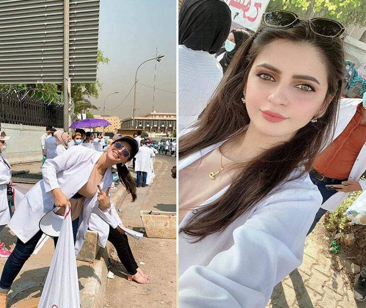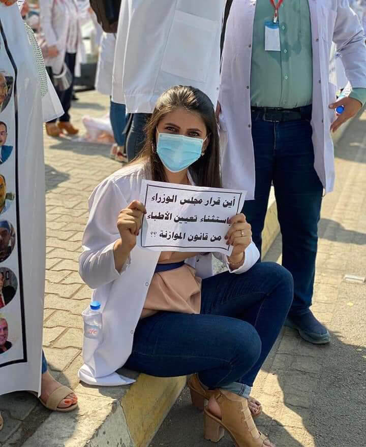 وتداول رواد مواقع التواصل الاجتماعي صوراً للطبيبة الحسناء التي شاركت بالوقفة الاحتجاجية، حاملةً لافتة كُتب عليها “أين قرار مجلس الوزراء باستثناء تعيين الأطباء من قانون الموازنة”.