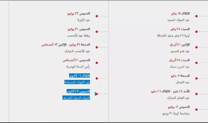 كان المستشار نادر سعد المتحدث الرسمي باسم رئاسة مجلس الوزراء، قال إنه نظرًا لأن بعض المناسبات والأعياد تقع في منتصف الأسبوع سيتم ترحيلها لتكون في نهاية الأسبوع ما عدا ثلاث مناسبات فقط، وذلك لإعطاء فرصة للمواطنين ليستفيدوا منها.
