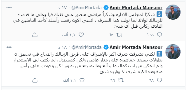 ومن جانبه ودع أمير مرتضى منصور، مدير الكرة بنادى الزمالك، جماهير القلعة البيضاء، بعد القرار الذى أصدرته وزارة الشباب والرياضة مؤخراً بإيقاف المجلس الحالى للقلعة البيضاء وإحالة مخالفاته المالية إلى النيابة العامة، وكتب أمير مرتضى عبر حسابه الشخصى على تويتر: اليوم صباحا تم توجيه الشكر لي على المرحلة السابقة، بالتالي اليوم أرحل عن نادي الزمالك بعد 28 شهراً وأعود لمكاني مشجعًا للنادي يومًا ما كان أقصى أحلامي منذ الطفولة هو ارتداء قميص نادي الزمالك والتشرف بتمثيله والفوز معه ببطولات كلاعب ولم تكتب لي.