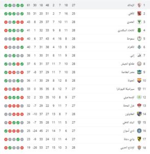 ووصل الأهلي إلى النقطة 55 جمعها من 25 مباراة ويلاحق الزمالك صاحب 61 نقطة من 27 مباراة وحل المصري ثالثا بـ 43 نقطة من 28 مباراة.