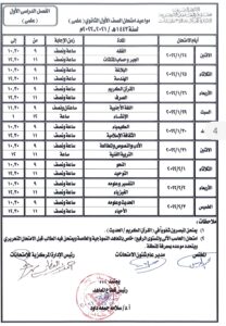 ويوم الخميس 20 يناير مواد حفظ القران وتجويده والتربية الفنية والحاسب الالى، ويوم السبت 22 يناير مادتى الثقافة الاسلامية والجبر، ويوم الاحد 23 يناير مادتى اللغة الاجنبية والمستوى الرفيع