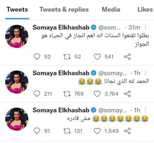 الخشاب لم تكتف بالتغريدتين فقط بل أعقبت ذلك بتدوينة أخرى تقول فيها: “بطلوا تقنعوا الستات أنه أهم إنجاز في الحياة هو الجواز”.