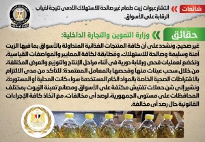 وقام المركز الإعلامي لمجلس الوزراء بالتواصل مع وزارة التموين والتجارة الداخلية، والتي نفت تلك الأنباء، مُؤكدةً أنه لا صحة لانتشار عبوات زيت طعام غير صالحة للاستهلاك الآدمي نتيجة لغياب الرقابة على الأسواق، مُشددةً على أن كل المنتجات الغذائية المتداولة بالأسواق بما فيها الزيت آمنة وسليمة وصالحة للاستهلاك، ومُطابقة لكافة المعايير والمواصفات القياسية، وتخضع لعمليات فحص ورقابة دورية في أثناء مراحل الإنتاج والتوزيع والعرض المختلفة، من خلال سحب عينات منها وفحصها بالمعامل المعتمدة؛ للتأكد من مدى الالتزام بالاشتراطات الصحية الخاصة بالمواد الخام المستخدمة سواء كانت المحلية أو المستوردة، مُشيرةً إلى شن حملات تفتيش مكثفة على الأسواق ومصانع تعبئة الزيوت بمختلف المحافظات على مستوى الجمهورية لرصد أي مخالفات، مع اتخاذ كافة الإجراءات القانونية حال رصد أي مخالفة.