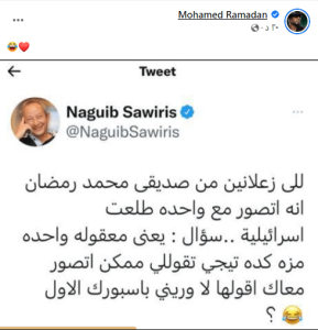 وقال رجل الأعمال المصري الشهير والصديق المقرب من محمد رمضان في تدوينة عبر حسابه الشخصي على ”تويتر“: ”للي زعلانين من صديقي محمد رمضان إنه اتصور مع واحدة طلعت إسرائيلية، سؤال: يعنى معقولة واحدة مزة كده تيجي تقوللي ممكن أتصور معاك أقولها لا وريني باسبورك الأول؟“. ونشر رمضان عبر صفحته الرسمية على موقع ”فيسبوك“، صورة عن منشور ساويرس، وأرفقها بوضع ”وجه ضاحك“ و“قلب أحمر“، في إشارة إلى إعجابه بما كتبه صديقه.