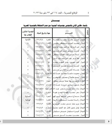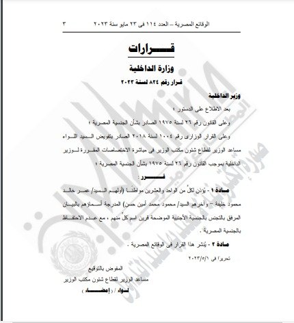 نشرت جريدة الوقائع المصرية في العدد 114 الصادر يوم 23 مايو سنة 2023، قرار اللواء محمود توفيق وزير الداخلية، رقم 824 لسنة 2023، بالسماح لـ21 شخص بالتجنس بجنسيات أجنبية مع عدم الاحتفاط بالجنسية المصرية.