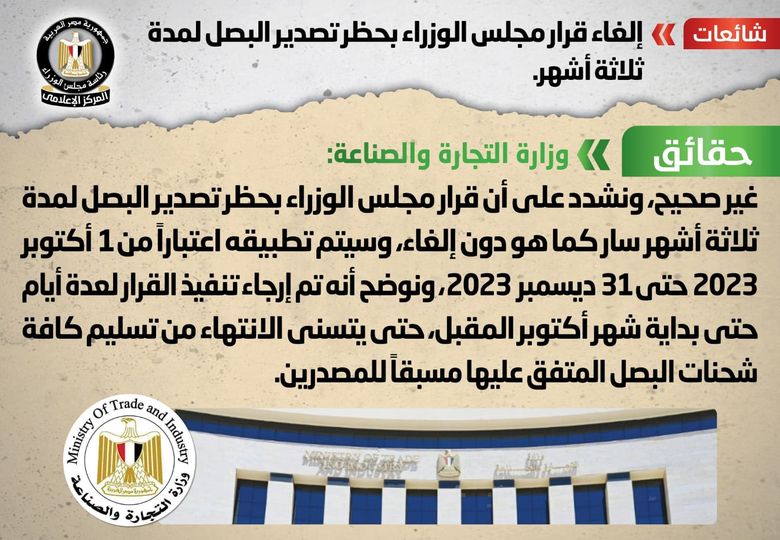 انتشر في بعض المواقع الإلكترونية وصفحات التواصل الاجتماعي أنباء حول إلغاء قرار مجلس الوزراء بحظر تصدير البصل لمدة ثلاثة أشهر، وقد قام المركز الإعلامي لمجلس الوزراء بالتواصل مع وزارة التجارة والصناعة، والتي نفت تلك الأنباء، مُؤكدةً أنه لا صحة إلغاء قرار مجلس الوزراء بحظر تصدير البصل لمدة ثلاثة أشهر، مُشددةً على أن قرار مجلس الوزراء بحظر تصدير البصل لمدة ثلاثة أشهر سار كما هو دون إلغاء، وسيتم تطبيقه اعتباراً من ١ أكتوبر ٢٠٢٣ حتى ٣١ ديسمبر ٢٠٢٣، مُوضحةً أنه تم إرجاء تنفيذ القرار لعدة أيام حتى بداية شهر أكتوبر المقبل، حتى يتسنى الانتهاء من تسليم كافة شحنات البصل المتفق عليها مسبقاً للمصدرين.