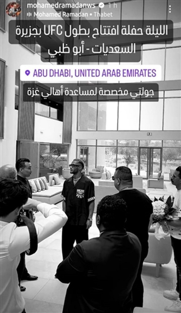 وذكر رمضان عبر خاصية “ستوري” في حسابه على “إنستغرام”: “الليلة حفلة افتتاح بطولة UFC بجزيرة السعديات بأبو ظبي، جولتي مخصصة لمساعدة أهالي غزة”.