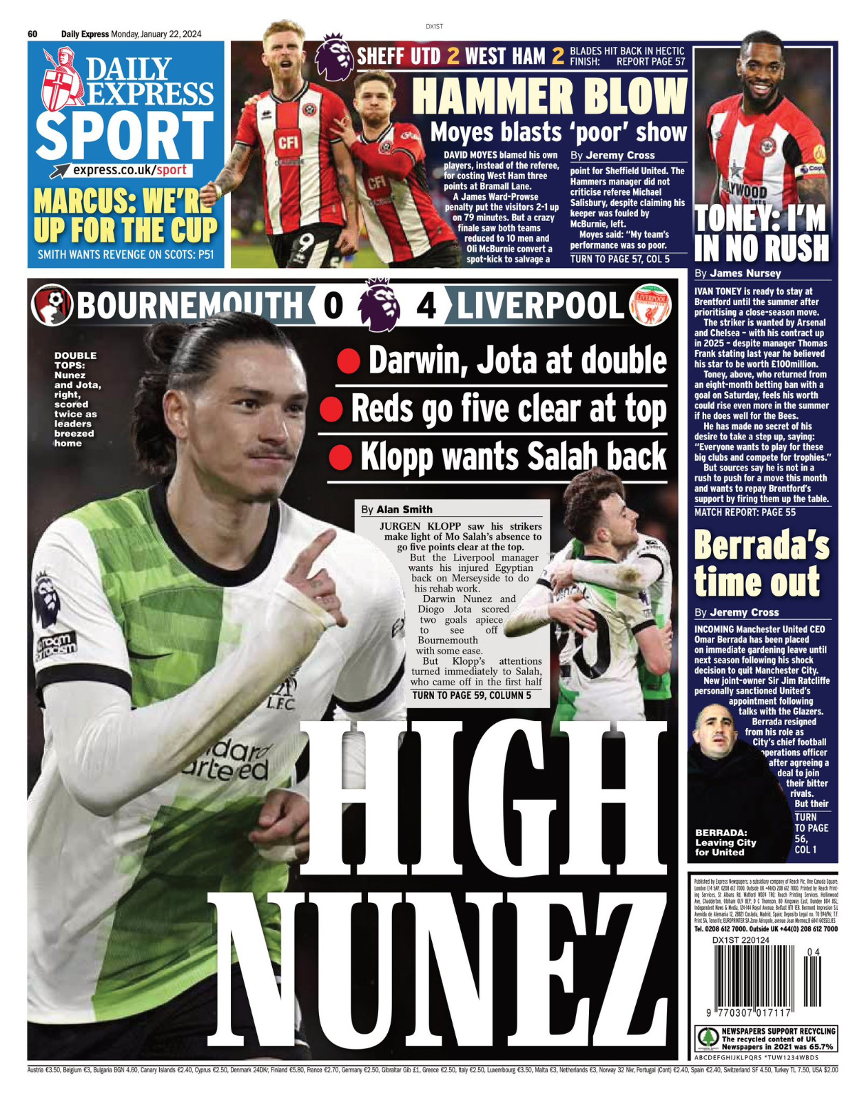 فيما جاء عنوان صحيفة “جارديان”: “داروين نونيز يسحق بورنموث.. وصلاح يحلّق عائدًا لليفربول للعلاج”.