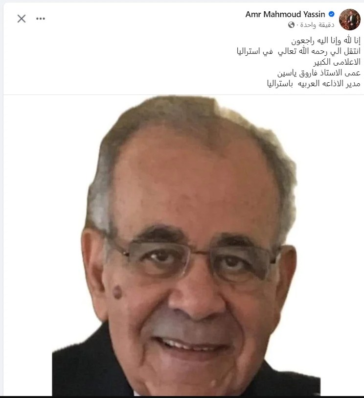 وكتب عمرو محمود ياسين، منشورًا وقال فيه: انتقل الي رحمه الله تعالي في أستراليا الإعلامي الكبير عمي فاروق ياسين مدير الإذاعة العربية بأستراليا.