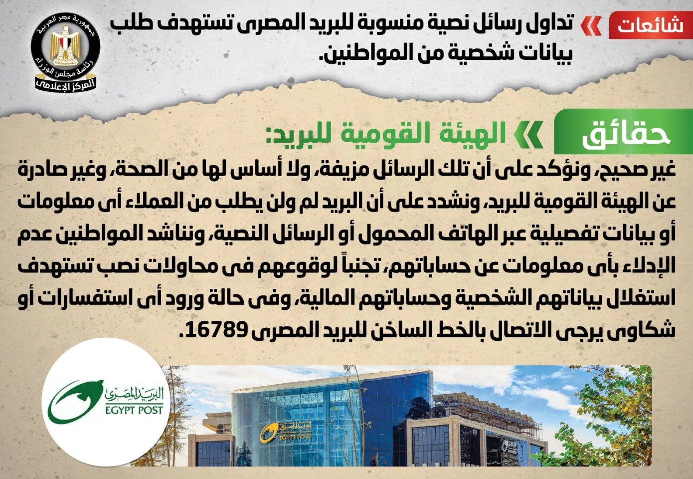 كشف المركز الإعلامى لمجلس الوزراء، إنه فى ضوء ما تم تداوله من بعض صفحات التواصل الاجتماعي رسائل نصية منسوبة للبريد المصري تستهدف طلب بيانات شخصية من المواطنين، تواصل المركز مع الهيئة القومية للبريد، والتي نفت تلك الأنباء، مُؤكدةً أنه لا صحة لإرسال البريد المصري أي رسائل تستهدف طلب أي بيانات من المواطنين تخص حساباتهم أو عناوينهم أو أي بيانات أخرى بزعم دفع تكاليف الشحن، وأن تلك الرسائل مزيفة، ولا أساس لها من الصحة، وغير صادرة عن الهيئة القومية للبريد.