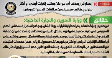 كشف المركز الإعلامى لمجلس الوزراء إنه فى ضوء ما تم تداوله من أنباء بشأن إصدار قرار بحذف أي مواطن يمتلك إنترنت أرضي أو أكثر من نوع هاتف محمول من بطاقات الدعم التمويني.