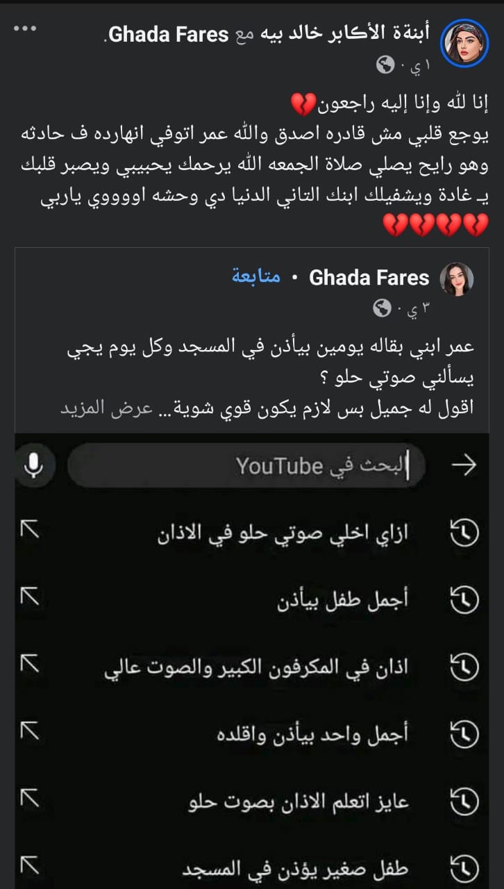 منشور “الخالة” فجع متابعي الطفل من رواد مواقع التواصل الاجتماعي، إذ جاء الخبر بعد يومين فقط من مشاركة والدته “غادة” منشورا على فيسبوك “تغزلت” من خلاله في ابنها ورغبته في أن يحسّن من صوته، لأنه يرغب في أن يكون مؤذنًا للمساجد.