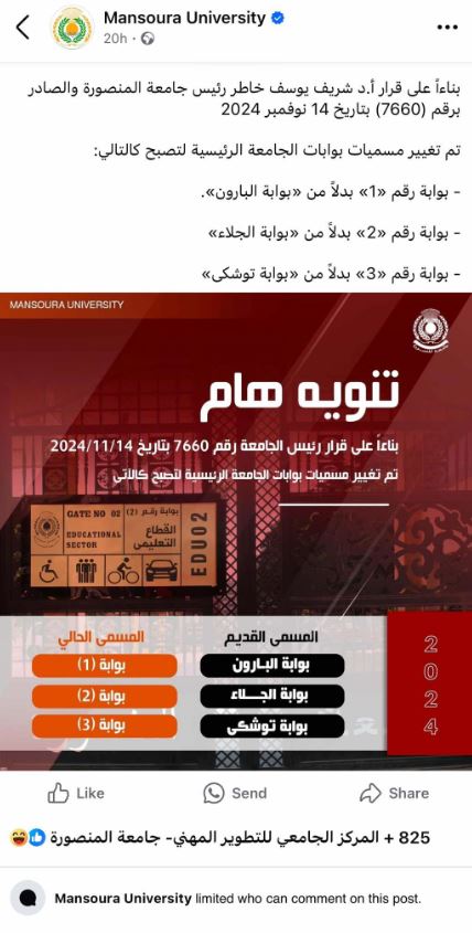 أغلقت جامعة المنصورة التعليقات الخاصة بمنشور تغيير مسميات البوابات الرئيسية على موقع فيسبوك، والذي نشرته الجامعة أمس ولاقى هجوما شديدا وسخرية وجدلا من قبل طلاب الجامعة وأبناء مدينة المنصورة.