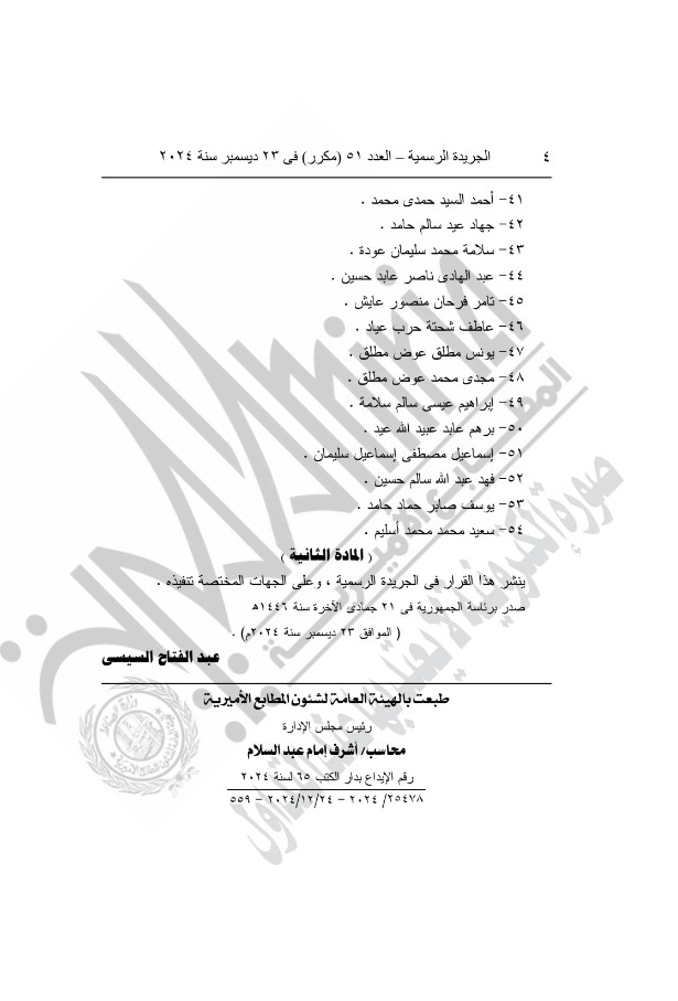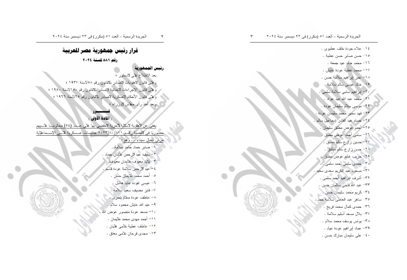 أصدر الرئيس عبد الفتاح السيسي القرار رقم 581 لسنة 2024 بالعفو عن العقوبة السالبة للحرية المقضى بها على عدد (54) محكومًا عليهم حضوريًا فى القضية رقم 811-80-2023 جنايات عسكرية كلى الإسماعيلية جزئى شمال سيناء، نشر القرار فى الجريدة الرسمية.
