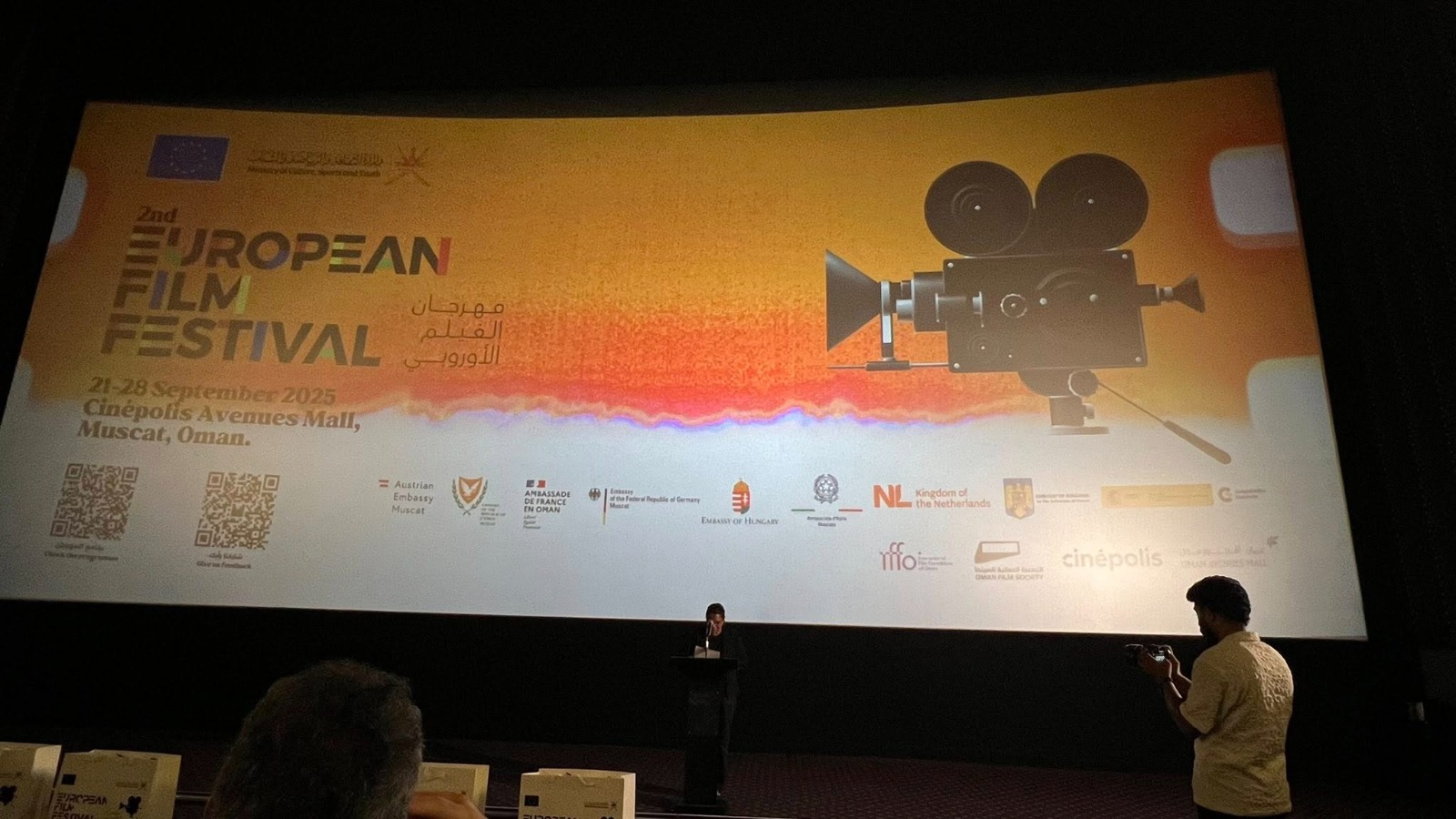 اختتم مهرجان الأفلام الأوروبية فعالياته في سلطنة عُمان بحفل فني وجماهيري كبير، كان مسك ختامه عرض الفيلم العُماني «زيانة» للمخرج الدكتور خالد الزدجالي، في أمسية شهدت حضورًا لافتًا من عشاق السينما، وعدد من السفراء والدبلوماسيين والمهتمين بالشأن الثقافي والفني.