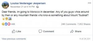 وكتبت “لويزا” سائحة المغرب الشهيرة التي لقيت حتفها في جريمة قتل مروعة، على صفحتها على مواقع التواصل الاجتماعي “فيس بوك”، قبل البدء في رحلتها وذهابها إلى دولة المغرب، “أصدقائي الاعزاء، أنا ذاهبة إلى المغرب في ديسمبر، أي منكم يا رفاق من حولها في ذلك الوقت أو أي أصدقاء الجبال الذين يعرفون شيئا عن جبل توبكال”.