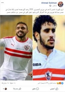 وكتب أحمد سليمان، عبر حسابه الرسمي بموقع التواصل الاجتماعي “فيس بوك”: “إزاي كهربا أحسن لاعب في الدوري المصري، وعبد الله جمعة أحسن باك شمال في مصر صناعة جروس في هذا المركز الذي يشهد عجز كبير في مصر برة منتخب مصر”.