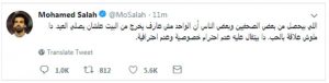 وقال صلاح عبر تويتر الآن بعد منعه من اداء صلاة العيد بسبب تجمع الاهالي أمام منزله: اللي بيحصل دا ملوش علاقة بالحب دا عدم احترام خصوصية.