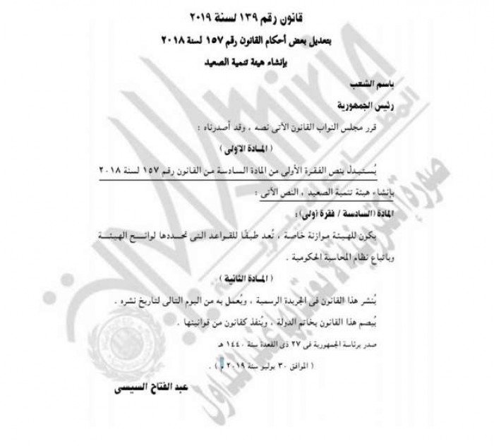 أصدر الرئيس عبد الفتاح السيسي، قرارا، بتعديل بعض أحكام القانون رقم 157 لسنة 2018 بإنشاء هيئة تنمية الصعيد، بعد موافقة وإقرار مجلس النواب.