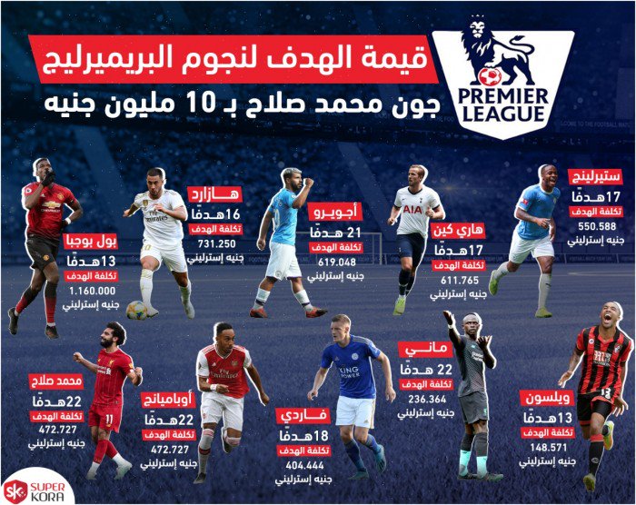 واحتل الفرنسي بول بوجبا لاعب خط وسط فريق مانشستر يونايتد الإنجليزي القائمة، بعدما سجل 13 هدفًا في الموسم المنقضي، لتبلغ قيمة الهدف الواحد مليون و160 ألف جنيه إسترليني ، وجاء إيدين هازار: 16 هدفًا (731.250 جنيه استرليني).