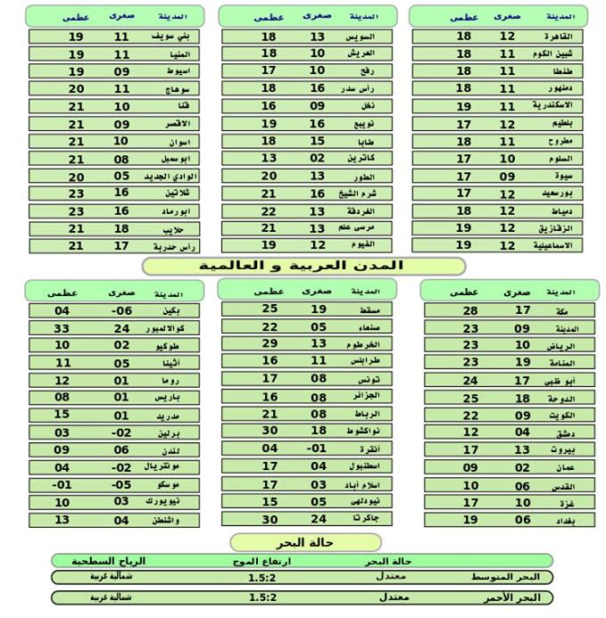 أفادت هيئة الأرصاد الجوية أن حالة طقس ساعات النهار اليوم السبت مائل للبرودة علي شمال البلاد حتي شمال الصعيد مائل للدفء جنوبا نهارا شديد البرودة ليلاً يصل الي حد الصقيع في وسط سيناء.