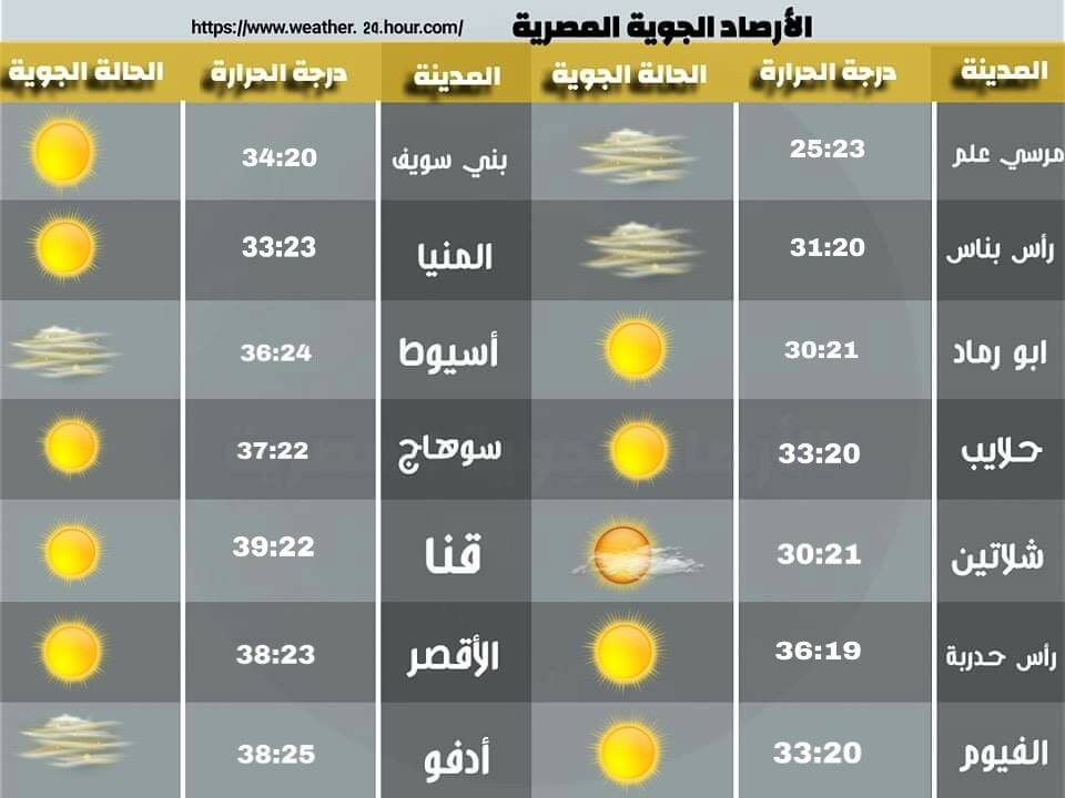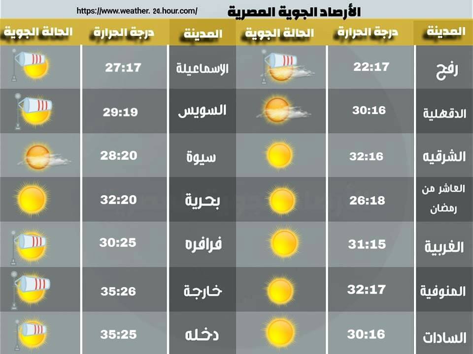 وأوضحت الهيئة أن الطقس سيكون حار نهارا لطيف ليلا على جنوب وشمال الصعيد.