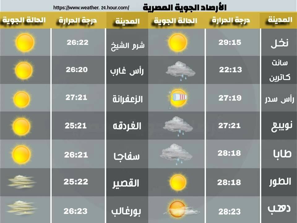 وقالت الهيئة إن الطقس سيكون لطيفا نهارا بارد ليلا على السواحل الشمالية الغربية والسواحل الشرقية ووسط سيناء مع سقوط أمطار خفيفة.